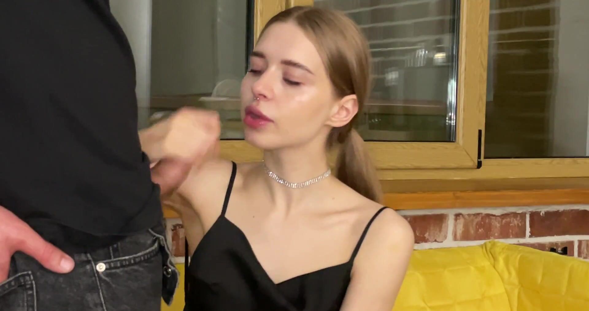 Молодая красотка хорошо сосет парню и получает порцию спермы на личико
