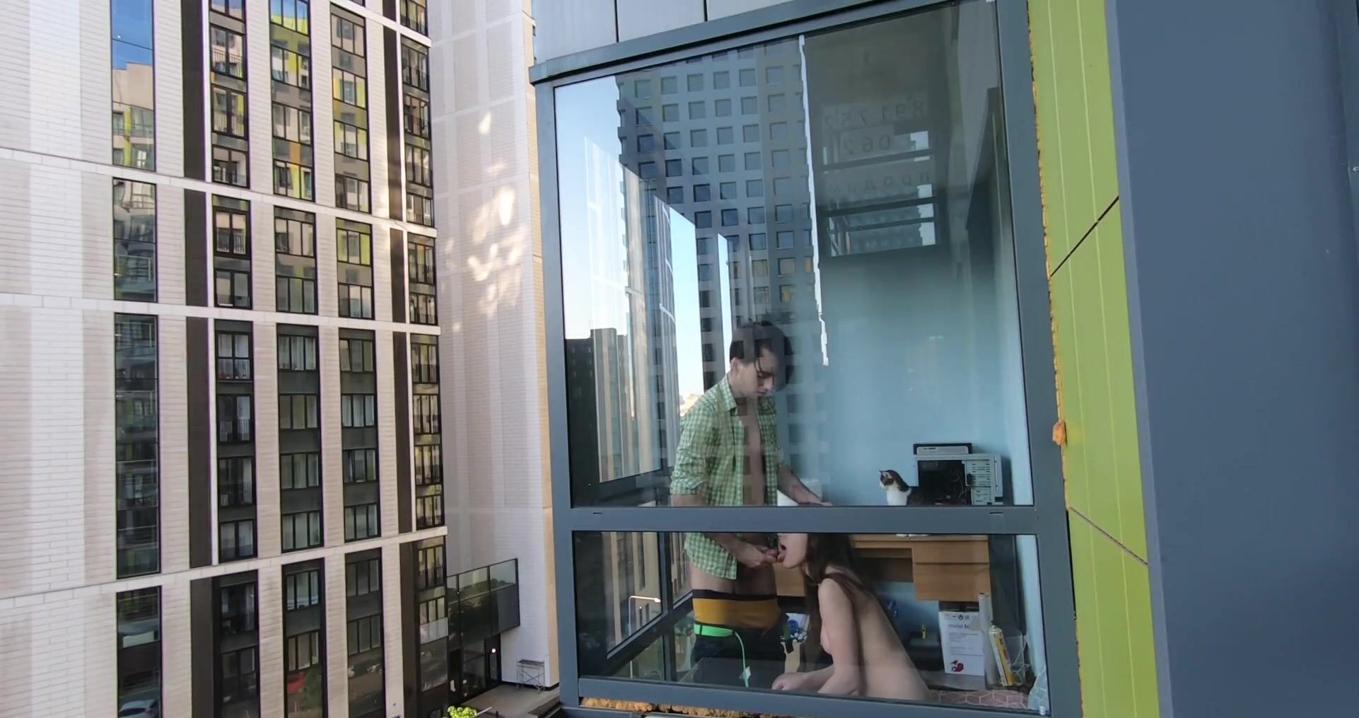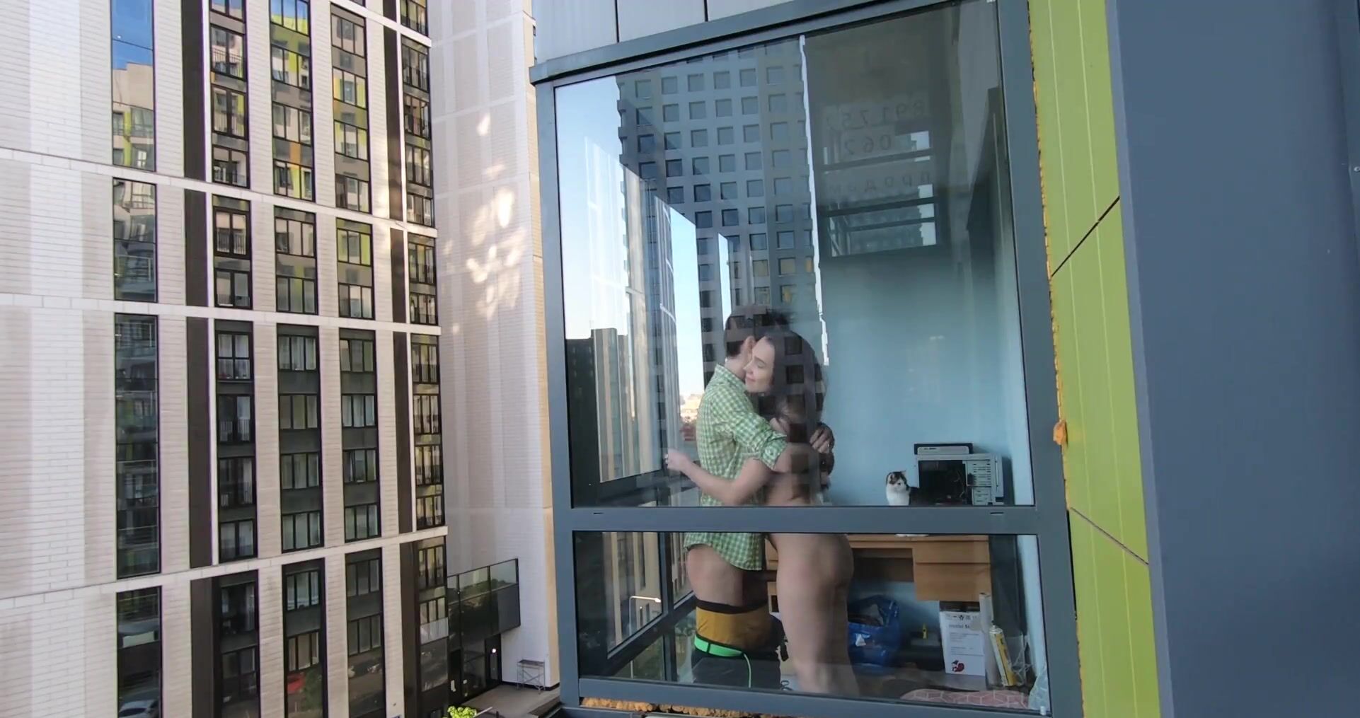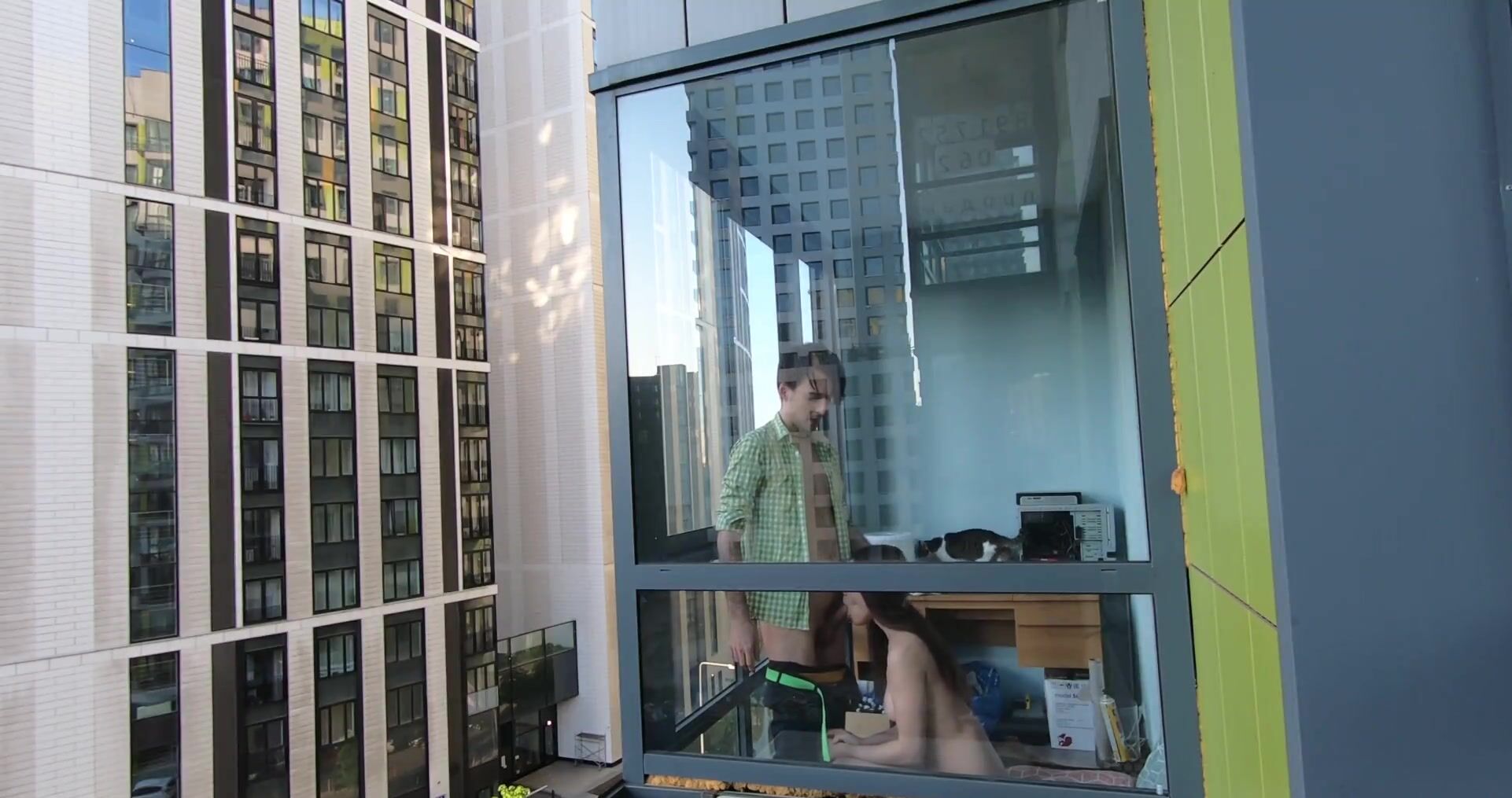 Молодая пара занимается сексом у окна, а сосед подглядывает