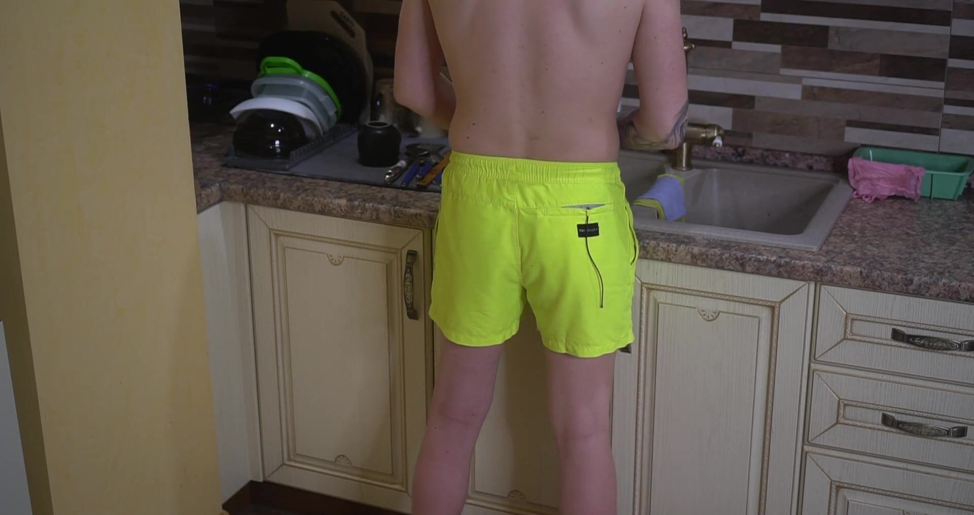 Милашка готовит обед в сексуальном фартухе, а парень хочет ее по домашнему