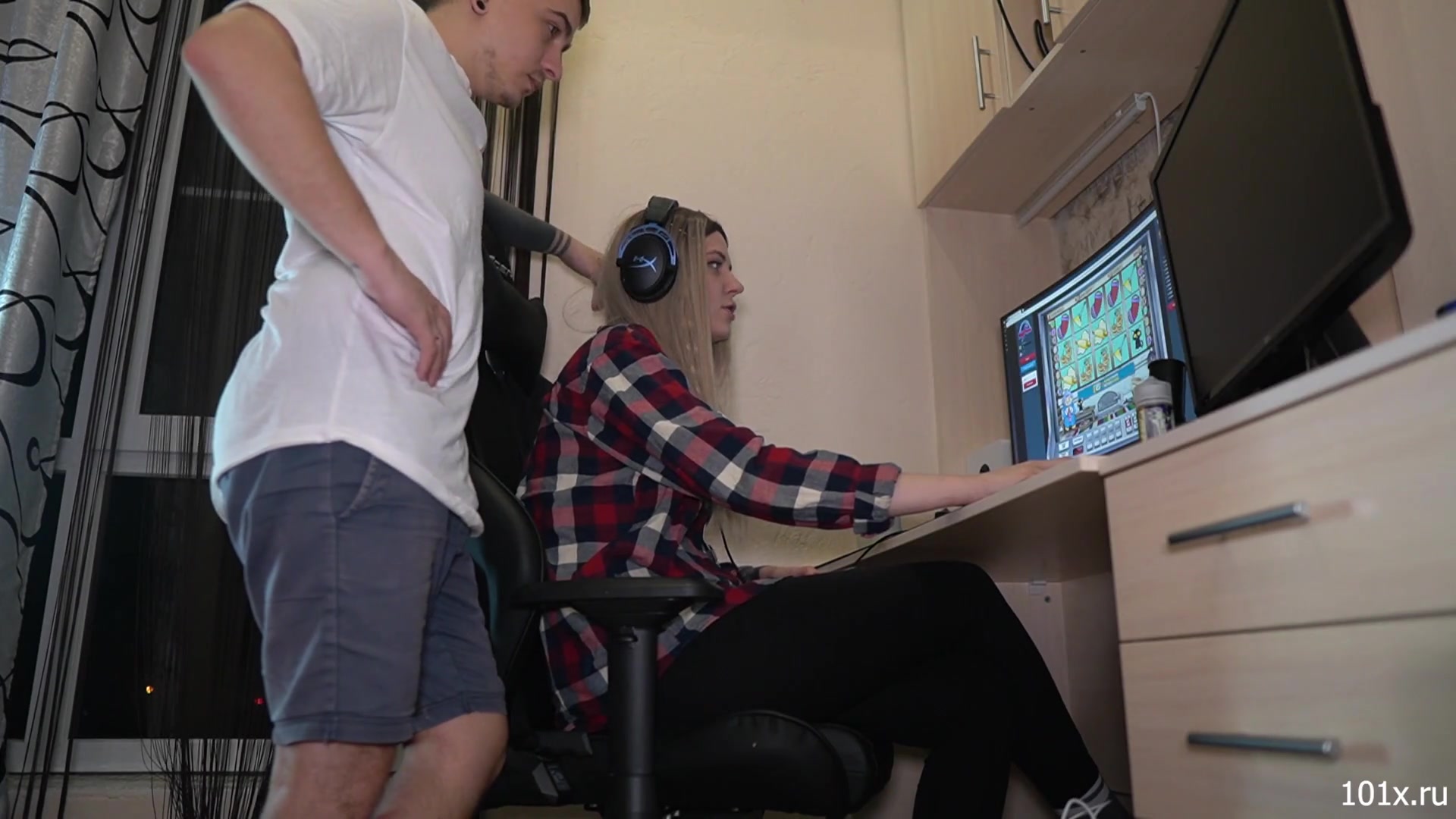 Пока муж занят игрой, жена изменяет у него за спиной!