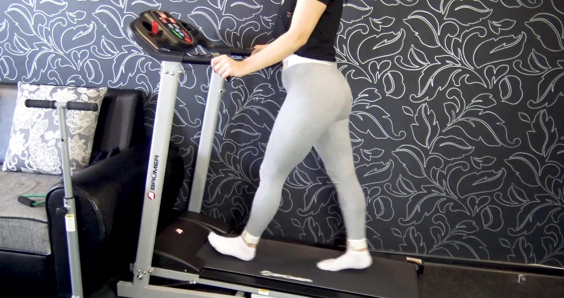 Русская женщина занимается домашним спортом и растягивает киску на камеру