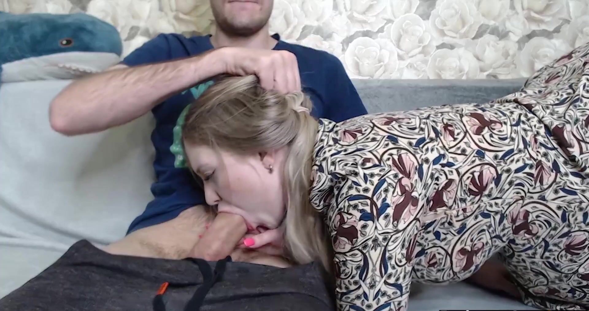 Русская сводная сестра делает парню минет, показывает грудь и принимает сперму в рот